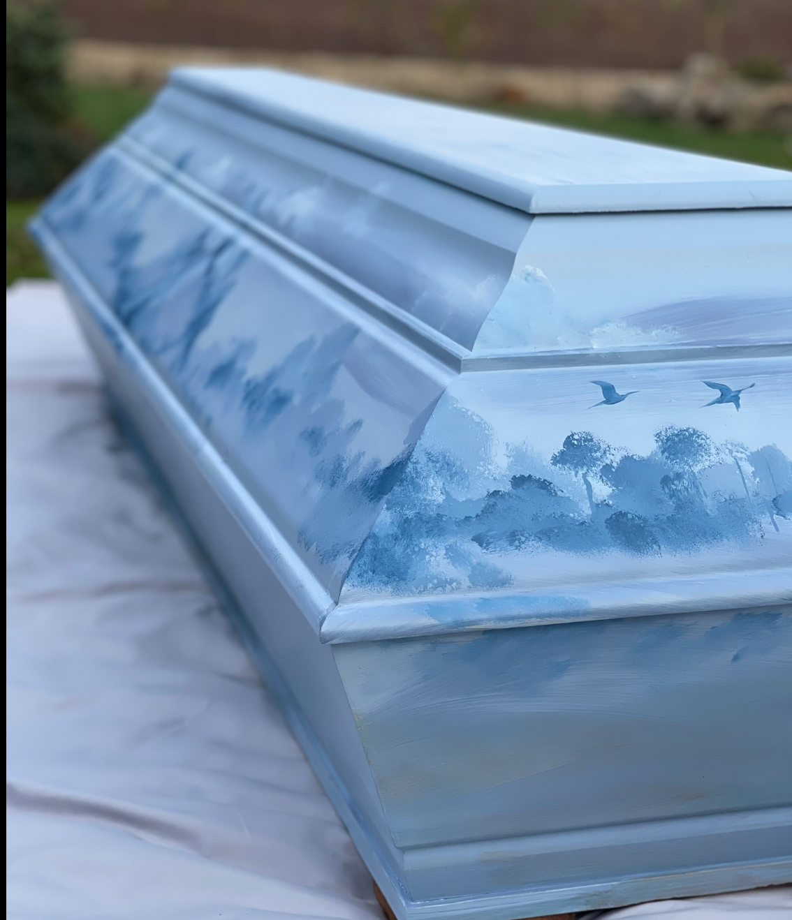 Ručně malovaná dřevěná rakev vytvořená na míru – podle přání rodiny, oblíbených barev, symbolů či příběhu, který k vašemu miminku patřil.